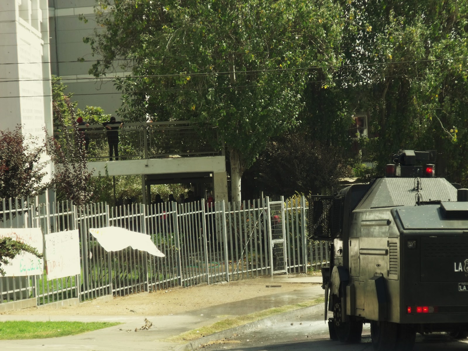 directo es el mejor homenaje. Armados/as de neumáticos y diferentes escombros, cortaron el tránsito de Av. Grecia con propaganda alusiva a la libertad de los/as compañeros/as en huelga de hambre quienes ya llevan más de 50 días en esa condición, para luego dar paso a un ataque frontal a los entes represores y fundamentales en la criminalización de la lucha proletaria utilizando bombas molotov y piedras, quienes no dudaron en atacar lanzando bombas lacrimógenas hacia los proletarios en guerra. El enfrentamiento duró aproximadamente 1 hora, y una vez que el material se agotó le dieron paso al repliegue al interior de la universidad; frente a esto la policía ingresó al campus lanzando bombas lacrimógenas a los estudiantes quienes los increparon para expulsarlos.